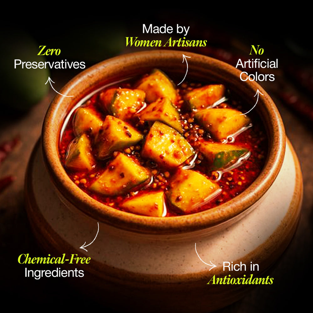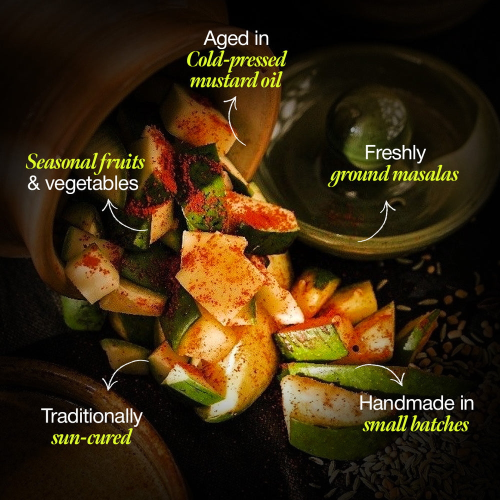 | Ingredients | Raw mango, salt, spices, cold-pressed mustard oil |